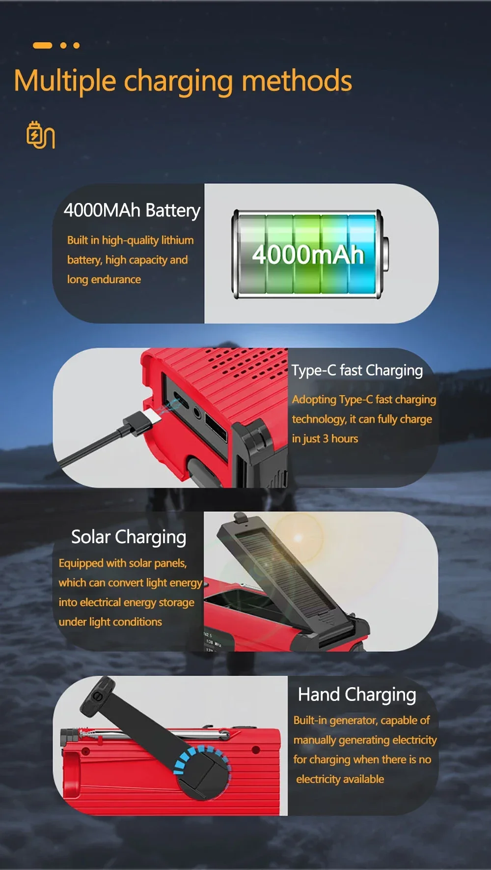1.Multifunctional emergency light with Type-C charging, solar charging, and manual charging modes