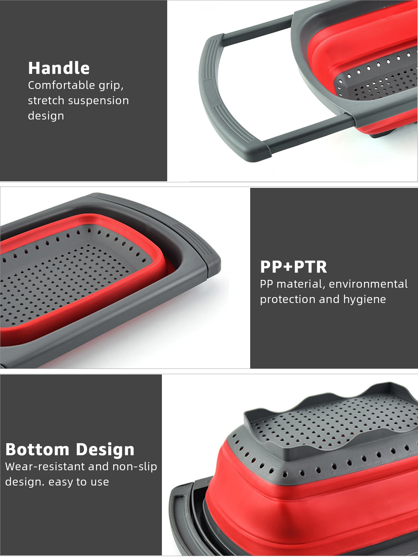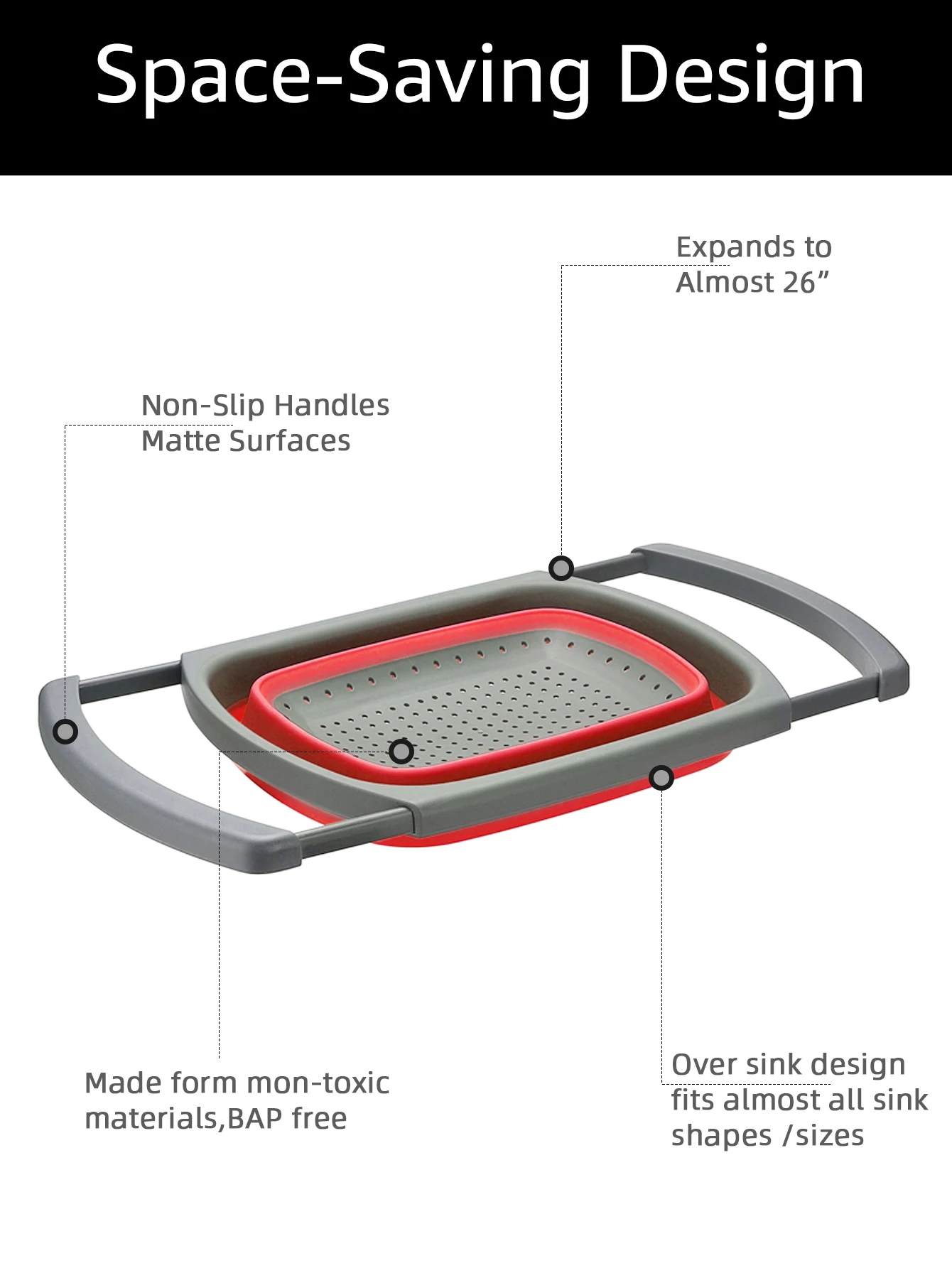 Anti-Slip Strainer – With a strong bearing force, this food colaner for kitchen sink can effortlessly accommodate 25 lbs max of weight and hold 7 Quart max, equivalent to 60 apples. Unlike other collapsible colander baskets that are easy to slip down when holding more stuff, our product features four anti-slip rubber pads and non-slip handles for stability over the sink.